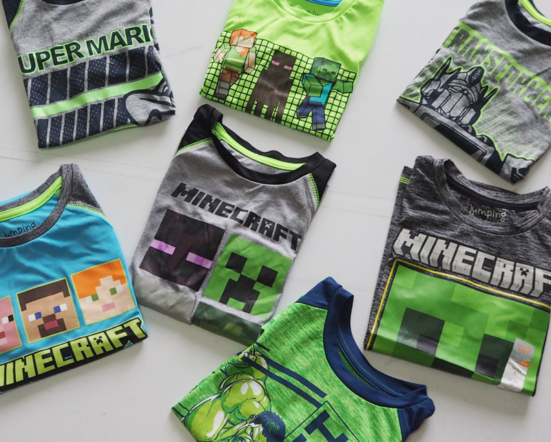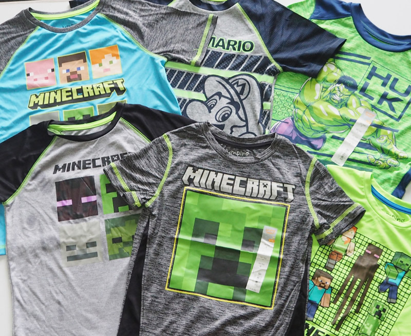 تيشيرتات ماينكرافت متعددة الألوان مع تصاميم شخصيات اللعبة.