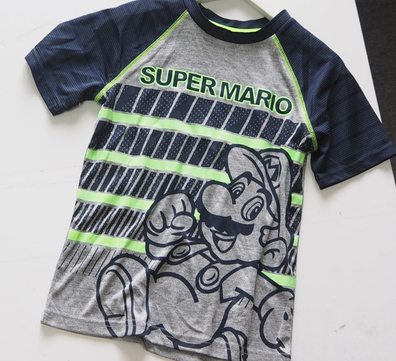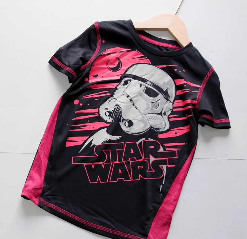 Graphic T-shirt featuring popular character designs with colorful striped background.