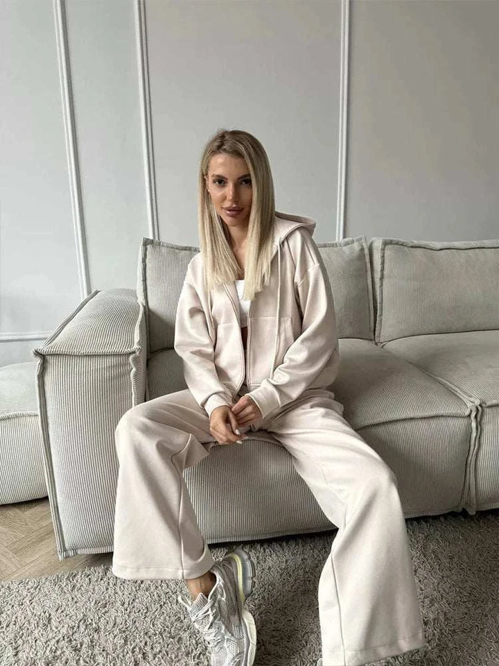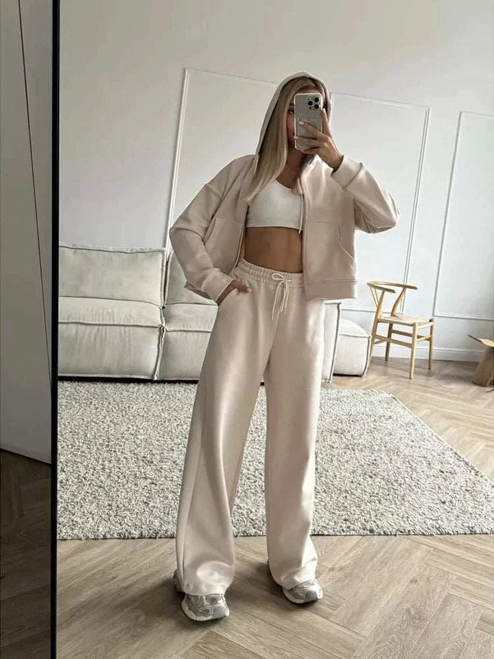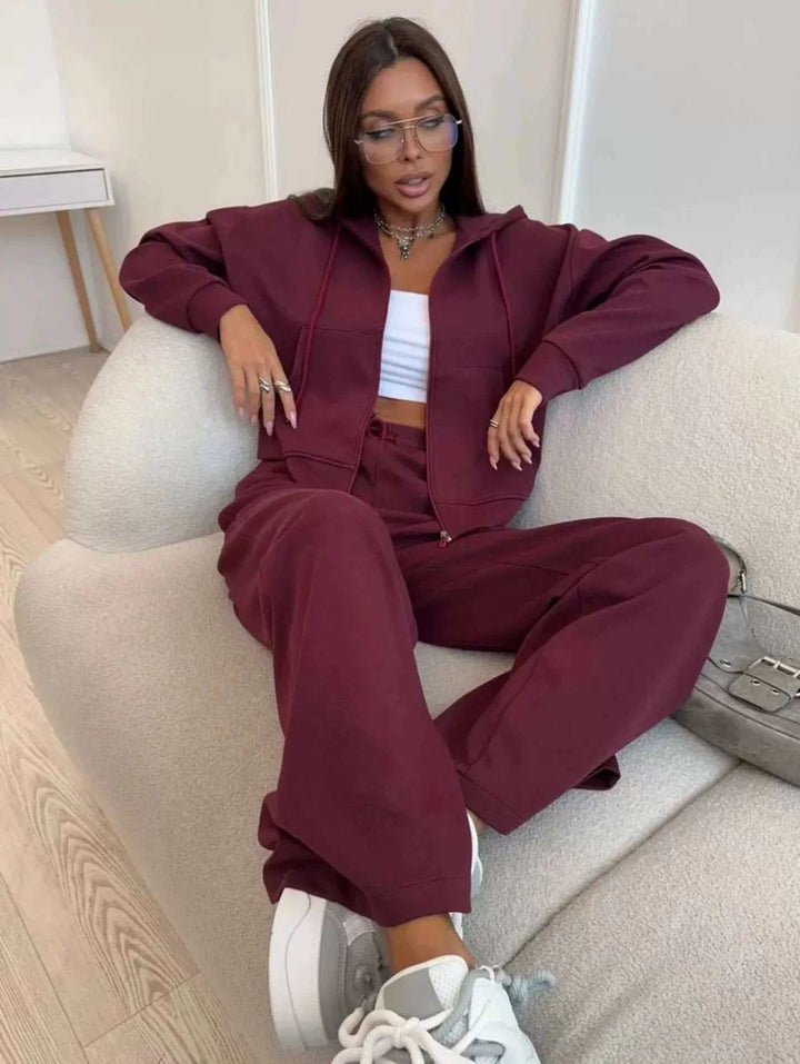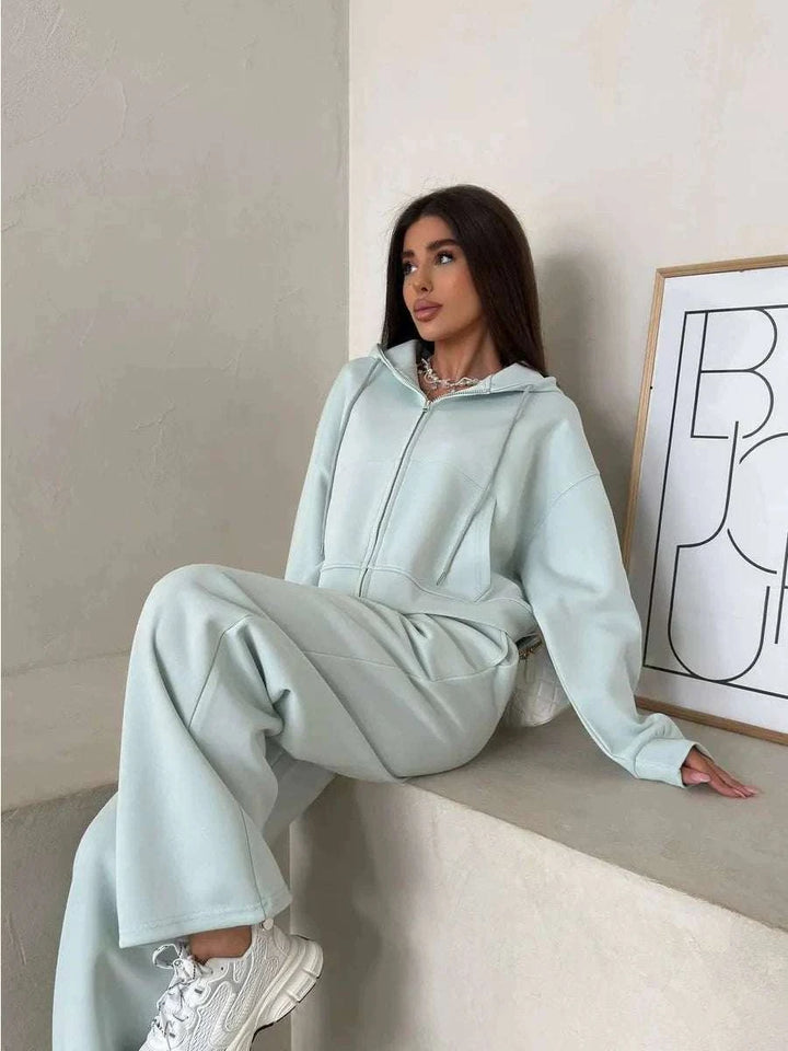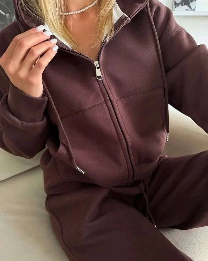 Discover a set that redefines comfort and elegance: Hooded Zippered Sportswear set with a hoodie design featuring a front zipper, and wide pants with an elastic waistband and adjustable drawstring. The Hooded Zippered Sportswear set is made from soft padded cotton fabric that hugs the body and provides warmth without heaviness. The Hooded Zippered Sportswear set comes in multiple trendy colors; brown, cream, light green, gray, black, pink, and maroon for elegant daily outfits. The Hooded Zippered Sportswear set includes side pockets and a kangaroo pocket, a strong metal zipper, and durable edges resistant to wear. The loose design allows freedom of movement for sports, errands, and lounging at home, while its comfortable cut gives a modern touch. Choose the Hooded Zippered Sportswear set as a staple piece for travel, light workouts, or luxurious casual looks; the quality of stitching and materials ensures colorfastness and a luxurious feel after washing. The Hooded Zippered Sportswear set is a distinctive choice for every season thanks to its durable fabric and elegant details. Seize now complete comfort and elegance in every thoughtful detail and launch your daily look with confidence and vitality with Loon.