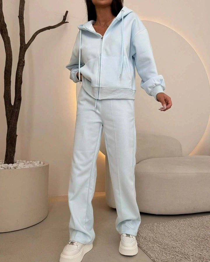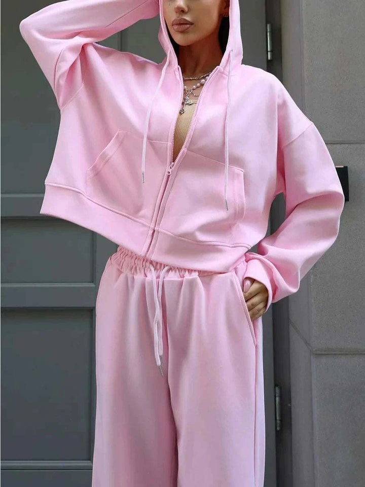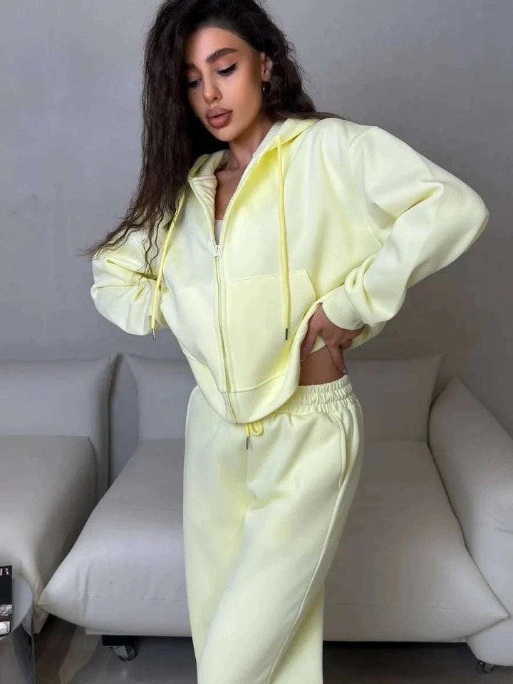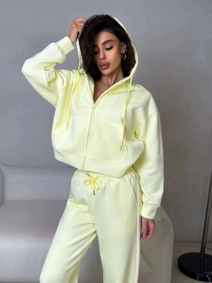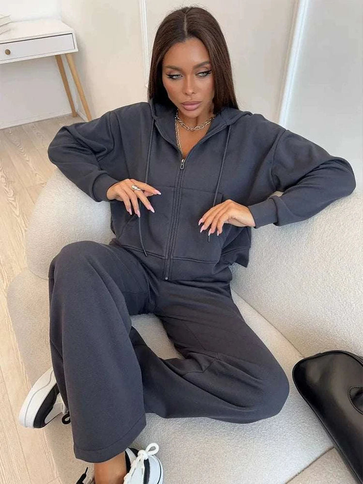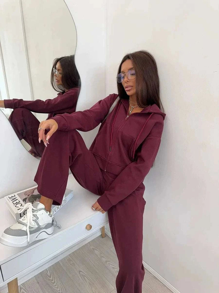Discover a set that redefines comfort and elegance: Hooded Zippered Sportswear set with a hoodie design featuring a front zipper, and wide pants with an elastic waistband and adjustable drawstring. The Hooded Zippered Sportswear set is made from soft padded cotton fabric that hugs the body and provides warmth without heaviness. The Hooded Zippered Sportswear set comes in multiple trendy colors; brown, cream, light green, gray, black, pink, and maroon for elegant daily outfits. The Hooded Zippered Sportswear set includes side pockets and a kangaroo pocket, a strong metal zipper, and durable edges resistant to wear. The loose design allows freedom of movement for sports, errands, and lounging at home, while its comfortable cut gives a modern touch. Choose the Hooded Zippered Sportswear set as a staple piece for travel, light workouts, or luxurious casual looks; the quality of stitching and materials ensures colorfastness and a luxurious feel after washing. The Hooded Zippered Sportswear set is a distinctive choice for every season thanks to its durable fabric and elegant details. Seize now complete comfort and elegance in every thoughtful detail and launch your daily look with confidence and vitality with Loon.
