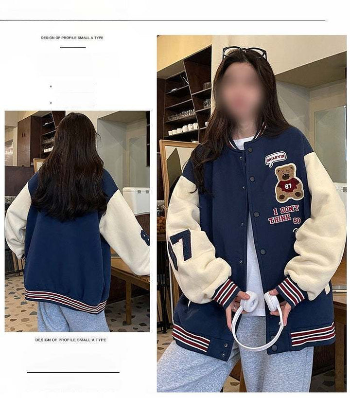 Discover comfortable elegance with the Korean version loose jacket, a jacket designed with a modern Persian touch; its loose fit provides freedom of movement and a stylish casual look. The Korean version loose jacket is made from soft and warm materials, featuring a warm inner lining and creamy ivory-colored sleeves that enhance the contrast with a dark purple or black body. The Korean version loose jacket features embroidered fringes, a woven bear badge with the number 87, and embroidery of the number 7 on the sleeve, practical side pockets, and a snap button closure for easy wear. The Korean version loose jacket is suitable for daily outings, university, and travel; it adds a layer of warmth without sacrificing style. The Korean version loose jacket guarantees meticulous sewing quality, striped edges with contrasting colors for a sporty elegant look and all-day comfort. The Korean version loose jacket is an ideal choice for those seeking a practical and durable youthful style. The design suits different layers with wrinkle-resistant and easy-to-wash fabric, also providing a padded collar for extra insulation, a soft feel to the touch, a slimmer appearance suitable for travel and variable weather, and is wear-resistant and guaranteed.