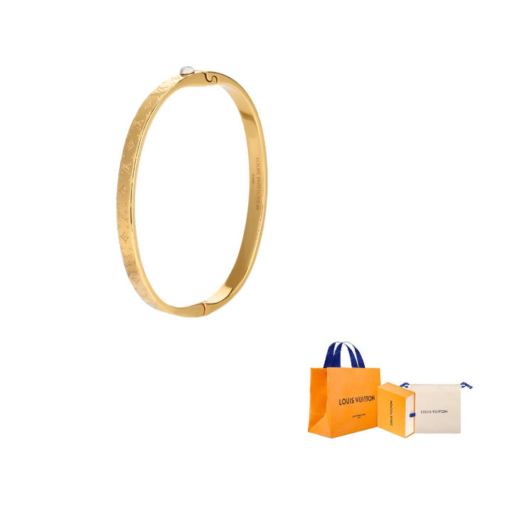 LOUIS VUITTON Logo engraved metal bracelet women's gold with elegant golden finish captivates attention with the details of the monogram engraving on the metal. The LOUIS VUITTON Logo engraved metal bracelet women's gold features lightweight and smooth texture ensuring daily comfort and continuous elegance. The delicate lines and secure clasp with a shiny metallic touch add an elegant contrast. The LOUIS VUITTON Logo engraved metal bracelet women's gold comes with an orange box and a fabric pouch with a blue drawstring reflecting a luxurious packaging experience. Its versatile design suits both formal and casual looks and works as a distinctive gift. The quality of craftsmanship and precision in engraving give you a piece that lasts and retains its shine. Choose the LOUIS VUITTON Logo engraved metal bracelet women's gold to complete your collection and highlight your uniqueness, and enjoy the comfort of the secure clasp and balanced weight. An investment in daily elegance that adds a luxurious touch to every occasion. Perfect for the woman seeking a symbol of luxury and practicality. The LOUIS VUITTON Logo engraved metal bracelet women's gold balances simplicity and distinction, while the LOUIS VUITTON Logo engraved metal bracelet women's gold