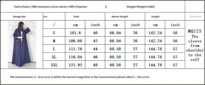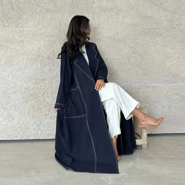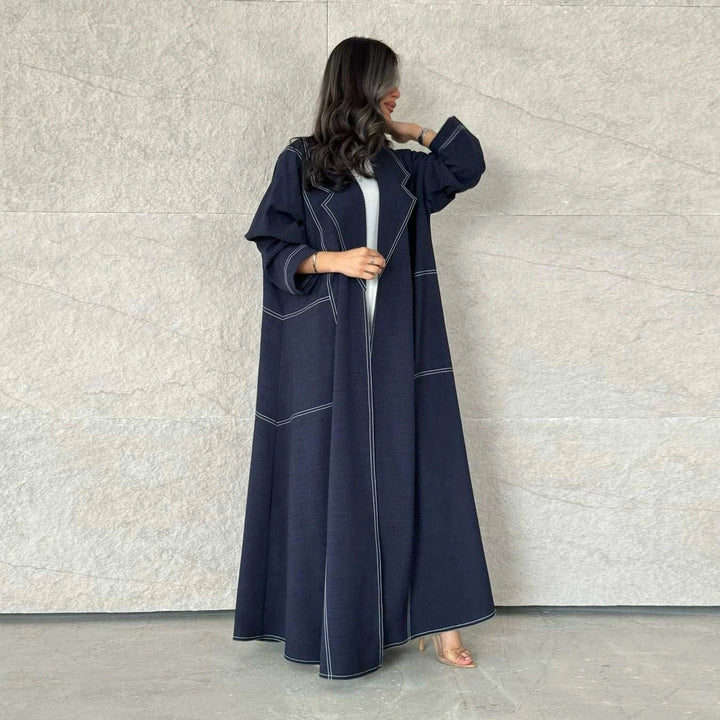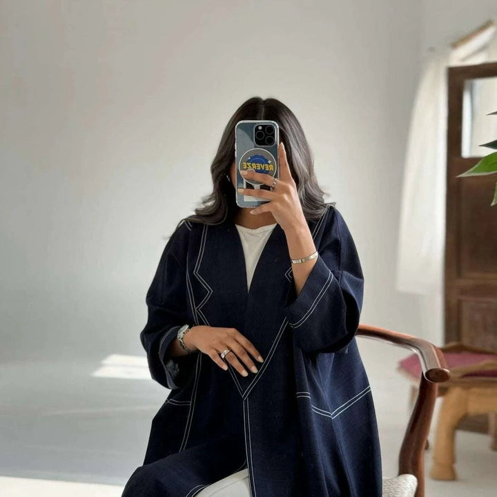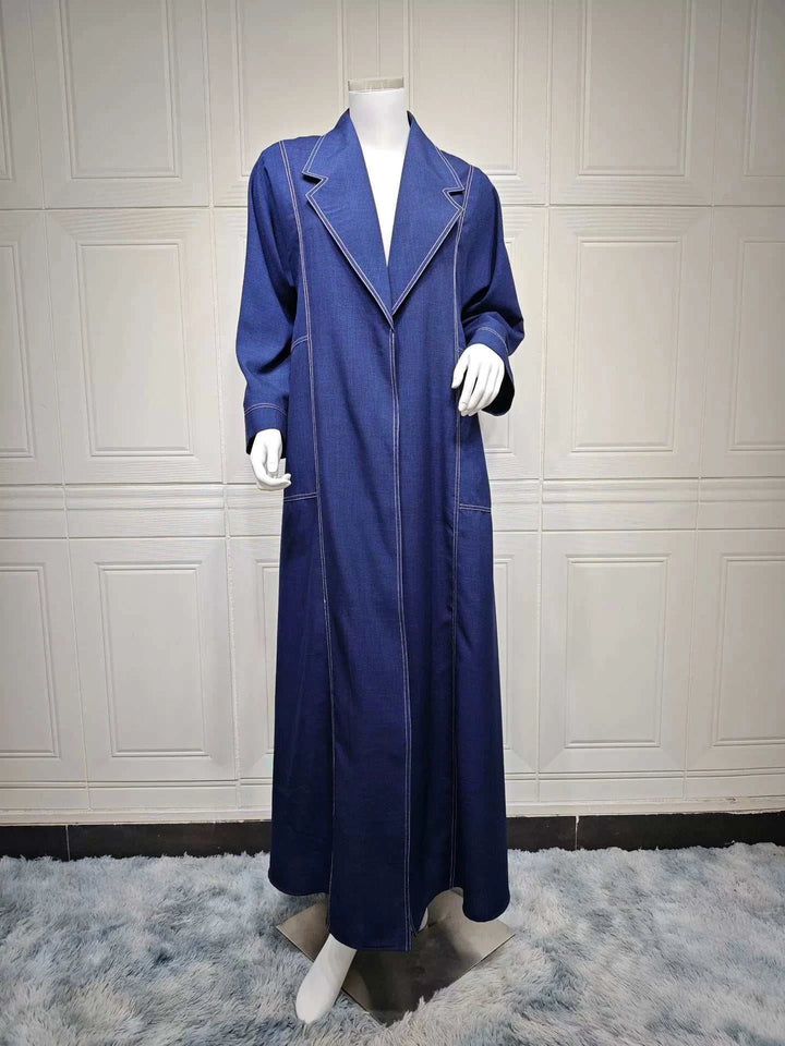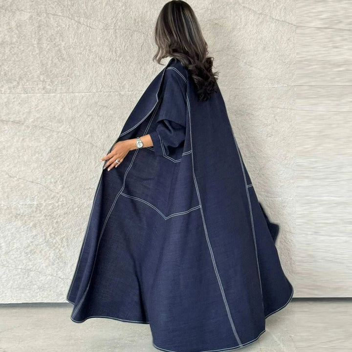 Denim robe عباية قطعة تجمع بين الأناقة والعملية بأسلوب معاصر. صُنعت Denim robe عباية من قماش دنيم محاكٍ قطني عالي الجودة بنفحة صناعية مريحة، بلون كحلي داكن مع خياطة بيضاء بارزة تضفي لمسة هندسية. تتميز Denim robe عباية بقصة واسعة وطول أرضي انسيابي يعطي حركة واحتشاماً مريحاً، مع ياقة شبيهة بالسترة وخطوط تصميم واضحة تبرز الحرفية. جيوب عملية وأكمام واسعة تضيفان وظائف يومية راقية. تناسب Denim robe عباية المناسبات الرسمية والكاجوال والسفر، سهلة التنسيق فوق ملابس أنيقة أو يومية. الخامة متينة وسهلة العناية، تمنح دفءًا خفيفًا وتهوية جيدة للراحة طوال اليوم. اختيار Denim robe عباية يعني استثماراً في قطعة مميزة ترفع مستوى إطلالتك وتعكس ذوقاً متجدداً، مثالية لمن تبحث عن جودة، راحة، وتميز بلا تنازل. اختاري Denim robe عباية لأناقة يومية تدوم، مع خامة لا تتلف بسهولة وتفاصيل خياطة دقيقة تمنحك طابعاً عصرياً وعملياً، تجربة ارتداء فاخرة تناسب كل الفصول وتدوم معك طويلًا وتجعلك محط الأنظار أينما ذهبتِ بأسلوب راقٍ