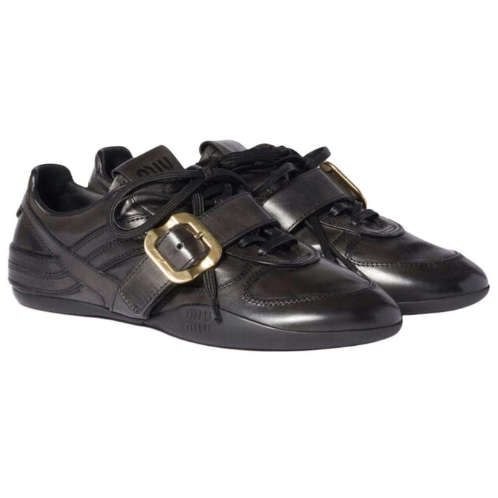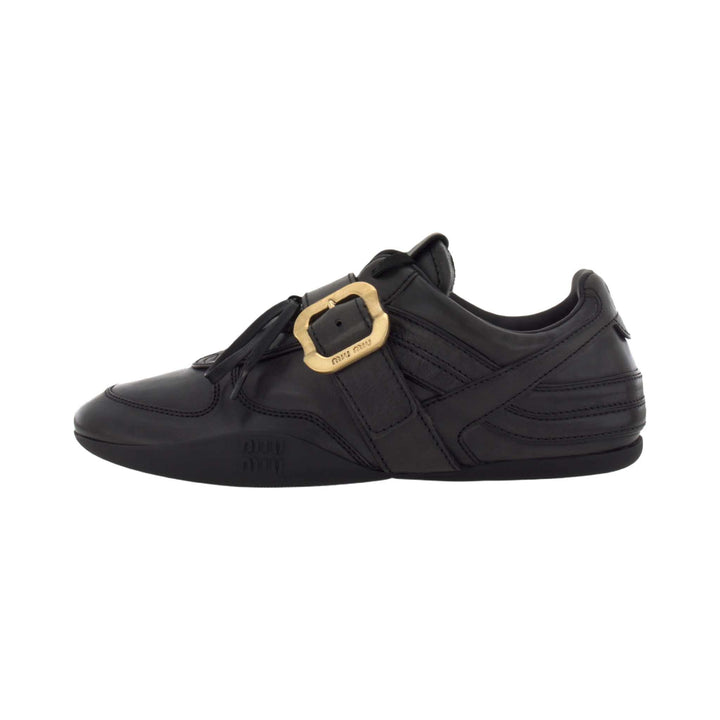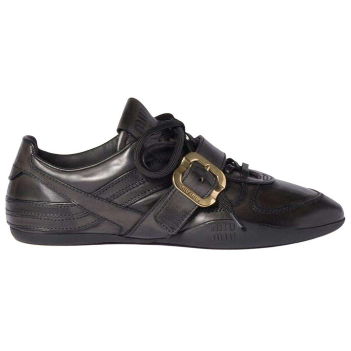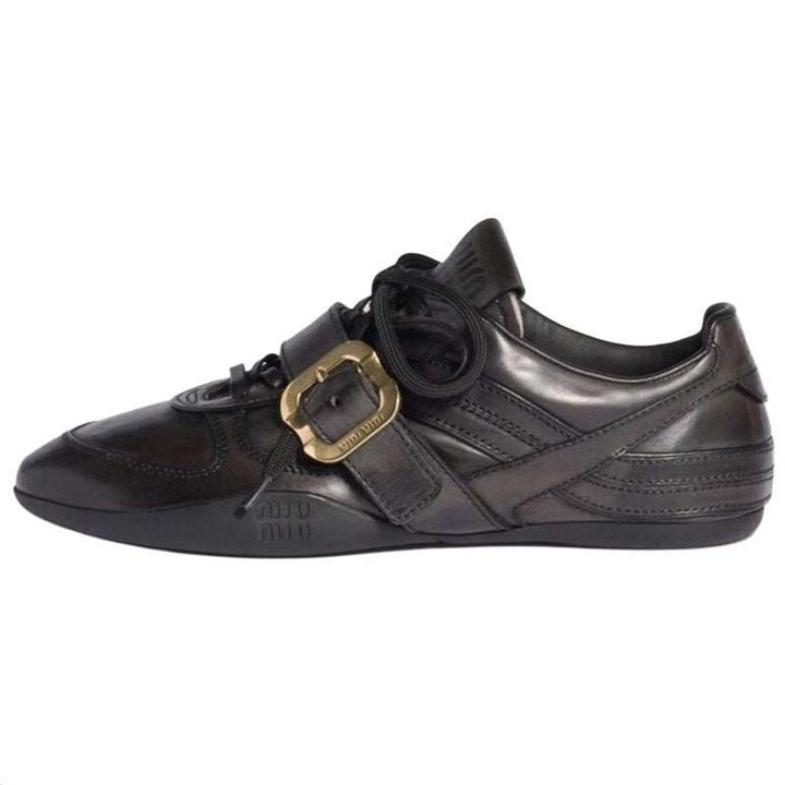 Choose for your elegant look the MIU MIU German Training Leather Black shoe that combines Italian craftsmanship with a modern sporty character. The MIU MIU German Training Leather Black features shiny black leather and a soft material that touches the foot comfortably, with a prominent golden buckle and a wide strap that adds a luxurious touch. The MIU MIU German Training Leather Black provides excellent support and a snug fit thanks to the padded lining and flexible rubber sole for daily walking. The MIU MIU German Training Leather Black is suitable for formal and casual outings, easily coordinated with various outfits. The MIU MIU German Training Leather Black shows fine details of embroidery, stitching, and the engraved MIU MIU logo that grants authenticity and distinction. Acquire the MIU MIU German Training Leather Black for an experience of lasting comfort, quality, and eye-catching tailoring. Its streamlined design with stitched edges and padded insole ensures foot stability and shock absorption, while the easy-to-clean luxurious leather makes the shoe suitable for daily occasions, travel, and work—an elegant investment that highlights your taste and gives you comfort all day long. With a finishing touch that reflects luxury and modernity. Guaranteed lasting elegance.