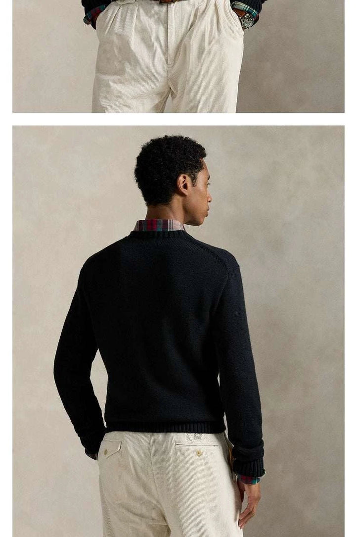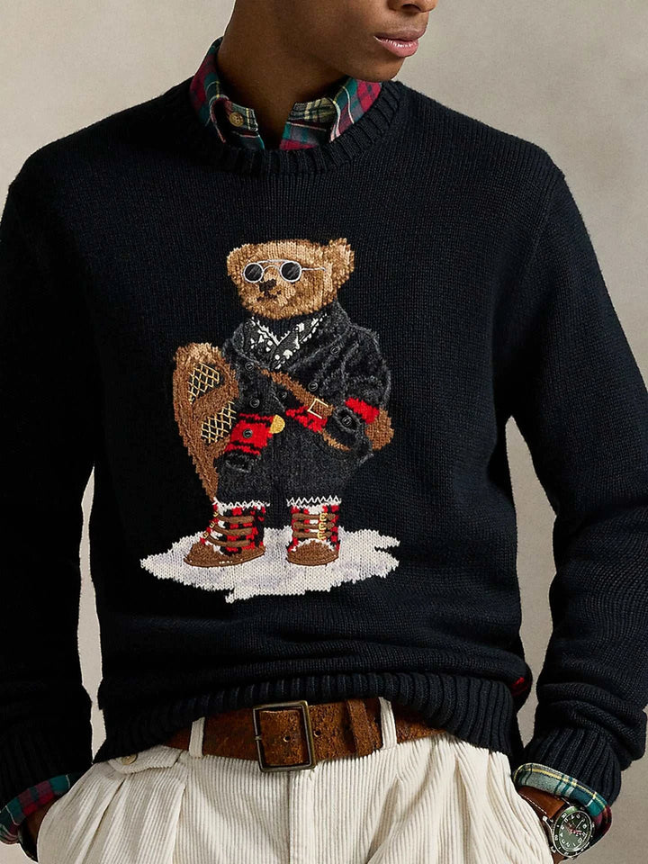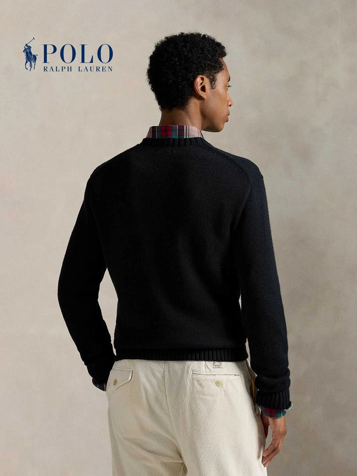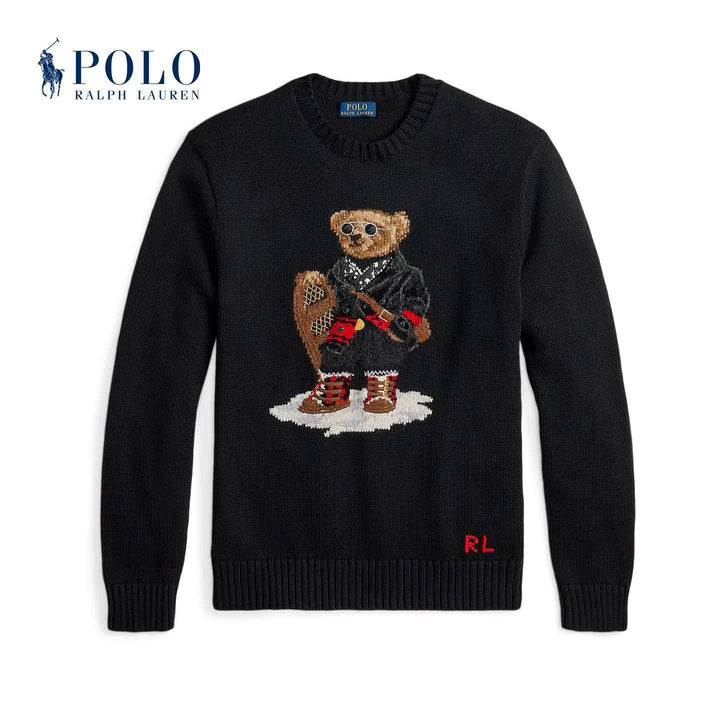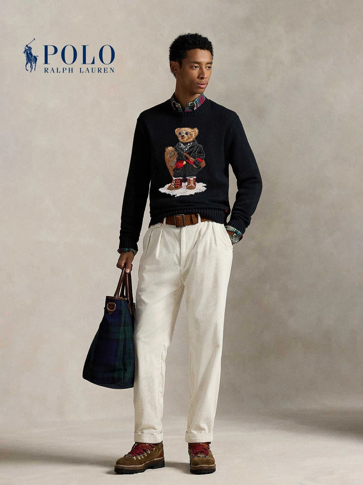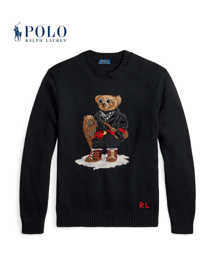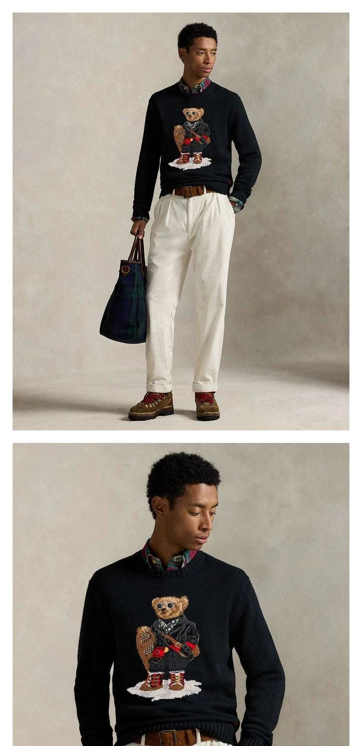 Ralph Lauren Men's Fall 25 Polo Bear sweater redefines fall elegance with a playful and luxurious touch. The black knitted design highlights an embroidered bear pattern in brown, red, and white colors, with details such as climbing shoes and a snow swing, and the RL logo embroidered in red at the hem. Ralph Lauren Men's Fall 25 Polo Bear combines the comfort of soft wool fabric and precise stitching quality that lasts season after season. Suitable for smart casual looks, it stands out over a plaid shirt or under a stylish coat, making Ralph Lauren Men's Fall 25 Polo Bear an ideal choice for outings, work, and holidays. The warm fabric, round neckline, and ribbed collar provide comfort and protection from the cold without losing style. Invest in an iconic piece that reflects your taste and gives you a distinctive presence; Ralph Lauren Men's Fall 25 Polo Bear adds a sense of distinction and quality to your wardrobe. The tactile details and texture show every stitch; Ralph Lauren Men's Fall 25 Polo Bear embodies heritage and fun, adding a luxurious touch daily.