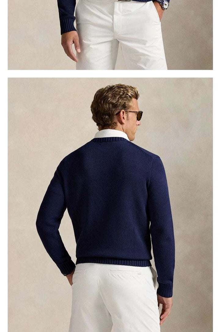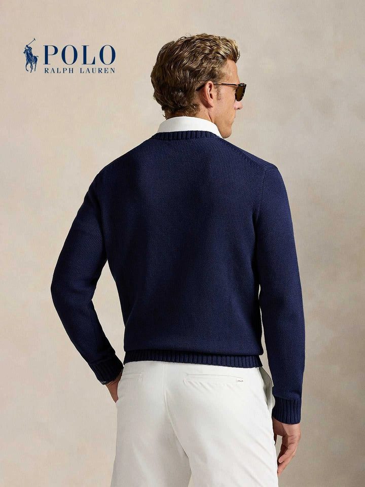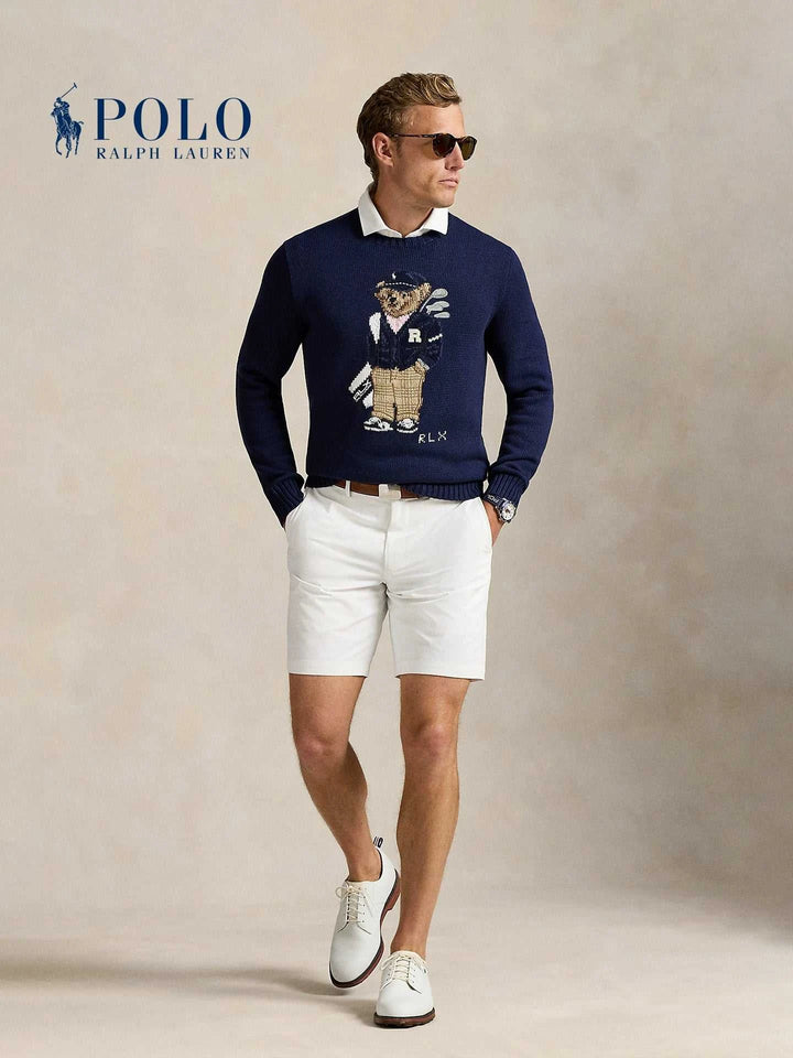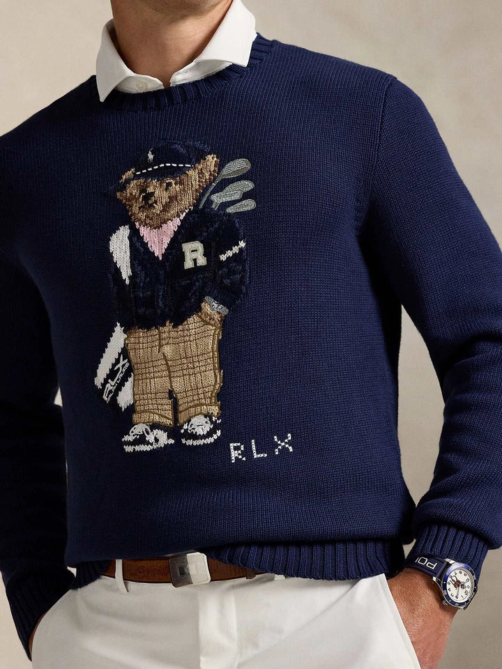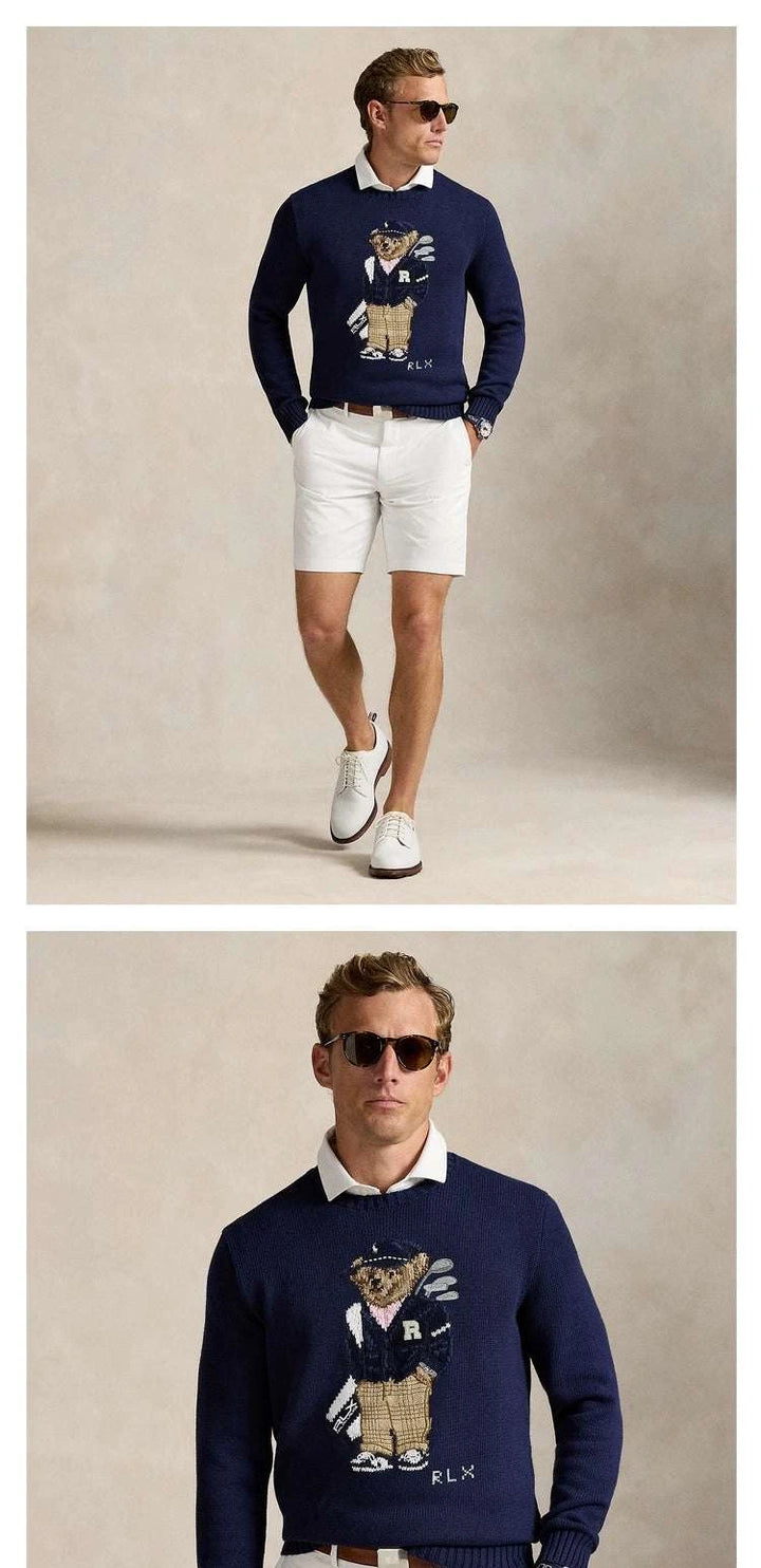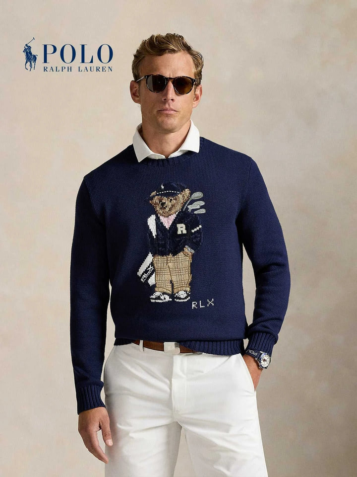 The perfect piece for the season with an elegant and playful touch, a deep navy wool sweater adorned with the distinctive golf bear print. Ralph Lauren Men's Polo Bear offers a perfect balance between classic style and a modern spirit. Ralph Lauren Men's Polo Bear is made from high-quality knitting with a soft texture and supported by ribbed edges that enhance durability and comfort. Ralph Lauren Men's Polo Bear suits daily looks or casual evenings with a white shirt underneath for a distinguished appearance. Ralph Lauren Men's Polo Bear is a sophisticated gift choice thanks to the exquisite embroidery details and the elegant RLX logo. Ralph Lauren Men's Polo Bear gives you a wide range of uses: from city strolls to golf course outings, with easy coordination with white pants or jeans. Ralph Lauren Men's Polo Bear expresses craftsmanship and attention to finishing, breathable and easy to care for with wrinkle resistance and the latest color coordination, providing a balance between comfort and visual clarity, making it a practical investment for daily elegance and maintaining its appearance for many years. With continuous elegance.