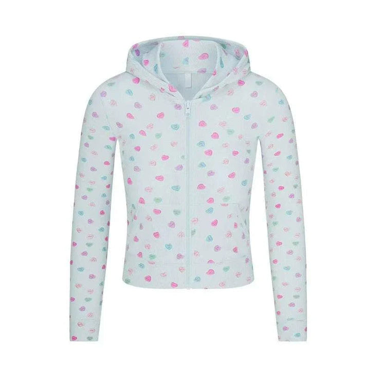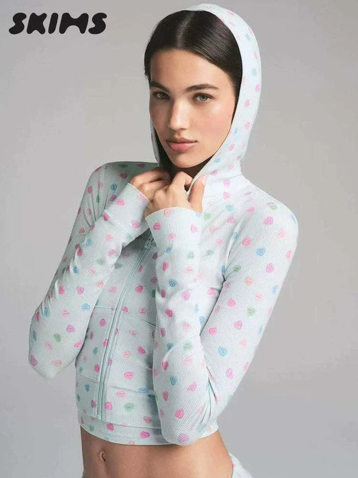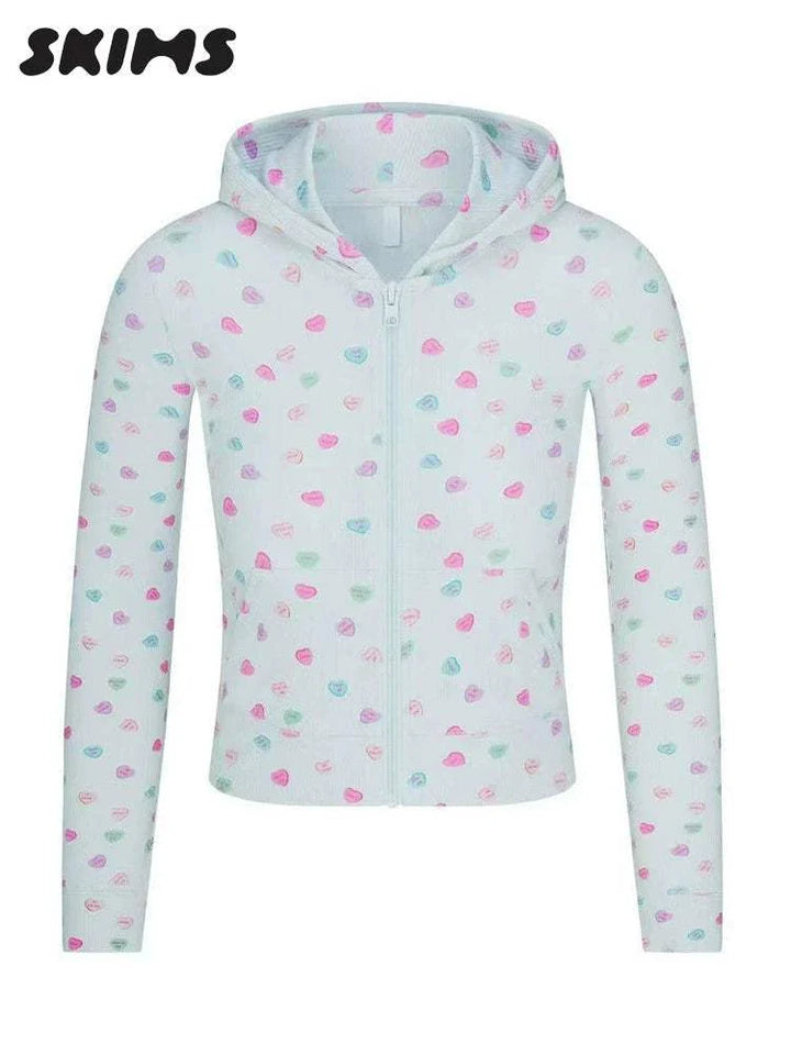 SKIMS Hooded Jacket Pants Loungewear combines modern design and absolute comfort, with a lightweight hood and front zipper for everyday flexibility. SKIMS Hooded Jacket Pants Loungewear comes in a light blue-green color with small heart prints in pink, blue, and green, adding a playful feminine touch. The soft ribbed texture fabric stretches and breathes to ensure all-day comfort. SKIMS Hooded Jacket Pants Loungewear features practical pockets, an elastic waistband with an adjustable drawstring, and wide pants with a comfortable cut for movement. This set is perfect for working from home, relaxing, traveling, or moving around with a stylish look. SKIMS Hooded Jacket Pants Loungewear reflects high-quality detailed tailoring, durable stitching, and a simple, elegant cohesive appearance. Choose SKIMS Hooded Jacket Pants Loungewear for a comfortable experience that combines beauty and practicality and invites you to buy with confidence. SKIMS Hooded Jacket Pants Loungewear is made from ultra-soft fabrics that care for the skin and retain shape after washing. The flexible design suits all seasons and gives you daily confidence and elegance. Ideal for calmness and daily care, easy to wash, and perfect as a gift. Suitable for all ages. With lasting elegance.
