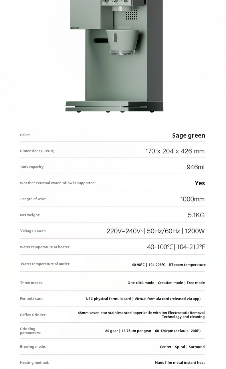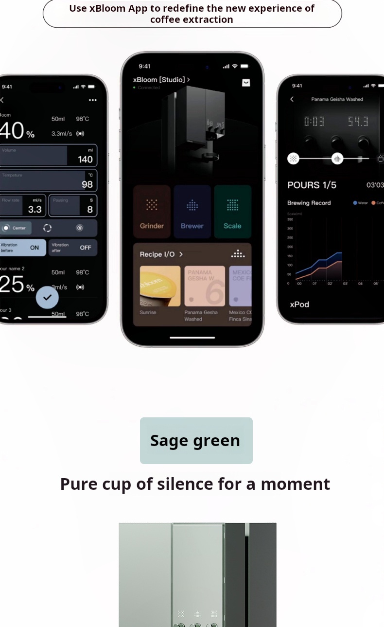 التصميم الهادئ بلون Sage Green يمنح مطبخك لمسة من الأناقة العصرية، مع أداء ذكي متكامل متصل بتطبيق xBloom App للتحكم بالوصفات، الإعدادات، ودرجة الطحن.