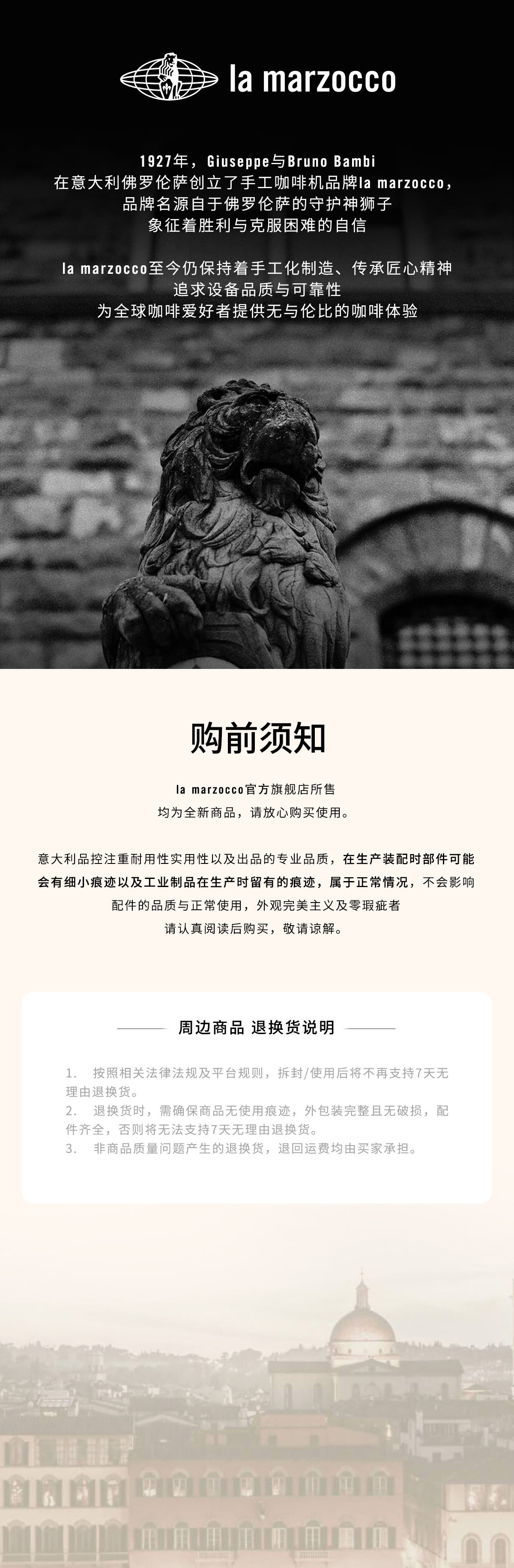 • يحمل شعار La Marzocco، العلامة الإيطالية الشهيرة في عالم القهوة.